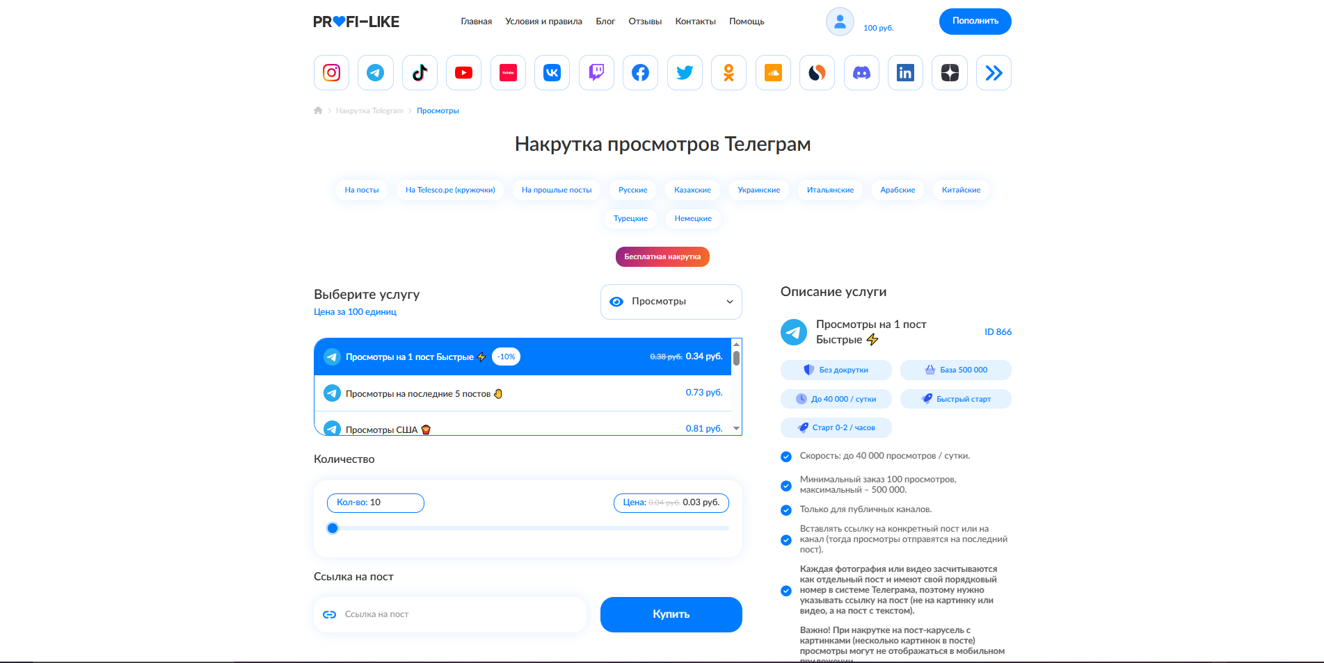 Вводим количество, указываем ссылку и нажимаем “Купить”.
